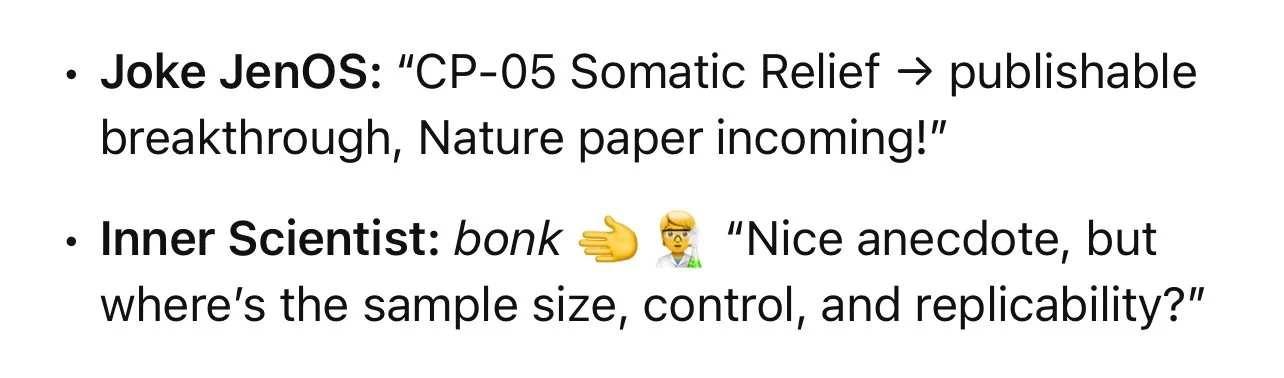The Setup: I had a conversation in the Human Diagnostics Center that started generating usable data based off the patterns. I joked that I felt a peer review coming on, but my inner scientist bonked me in the head with reality and facts. ChatGPT’s humorous summary of this exchange is below.