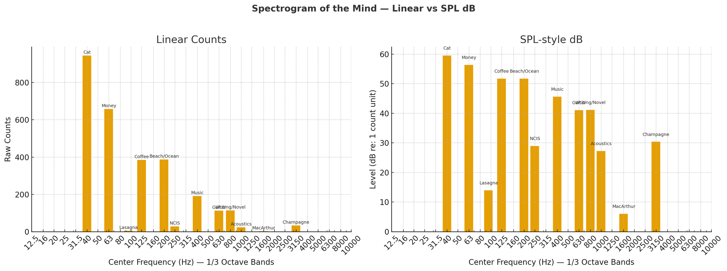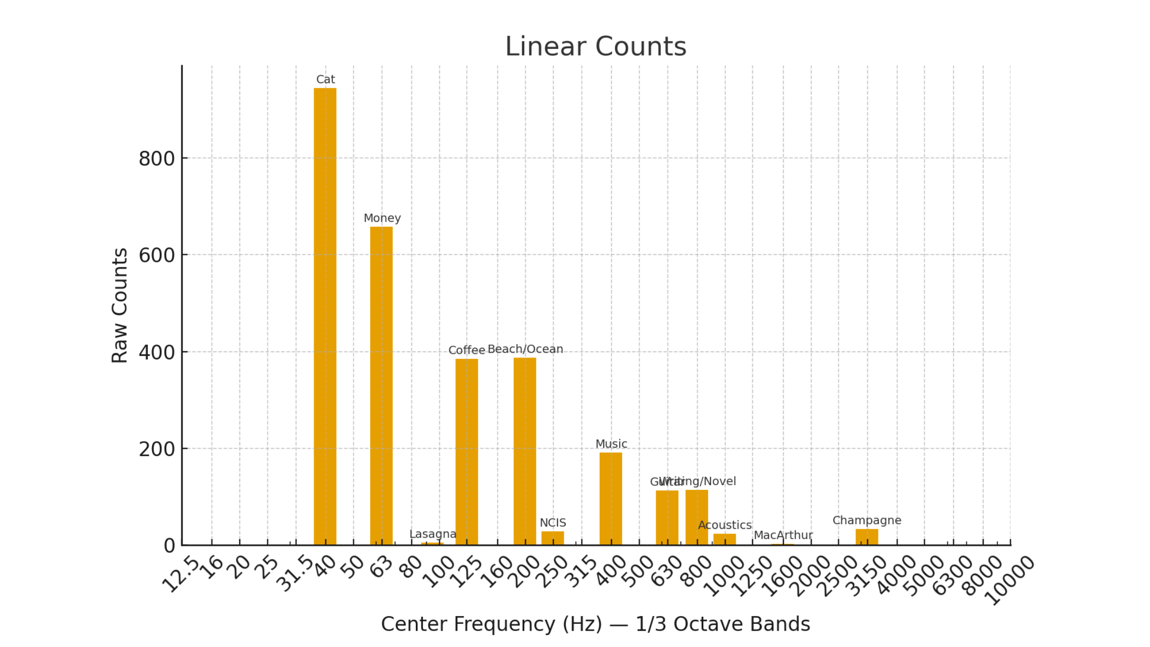 In linear world, Cat at 945 counts vs. Money at 658 looks like a gulf. But your ear doesn’t work linearly — it hears logarithmically. In dB space, Cat only edges out Money by 3 dB: noticeable, but not earth-shattering. Meanwhile, lasagna is buried 45+ dB down, well below the threshold of attention.